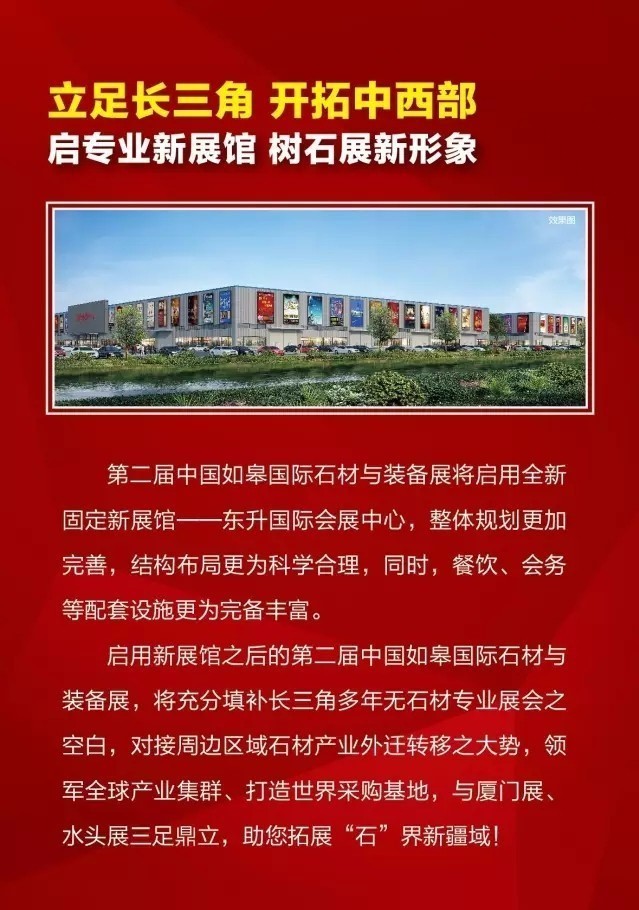 洪鴻志表示,今年第二屆如皋國際石材與裝備展將啟用全新固定的新展館——東升國際會展中心,新展館在整體規(guī)劃方面更加完善,結構布局也更為科學合理,同時,餐飲、會務等配套設施更為完備豐富。啟用新展館之后的如皋國際石材與裝備展,將充分填補長三角多年無石材專業(yè)展會的空白,對接周邊區(qū)域石材產(chǎn)業(yè)外遷轉(zhuǎn)移之大勢,領軍全球產(chǎn)業(yè)集群、打造世界級石材采購基地,將與廈門展、水頭展三足鼎立。